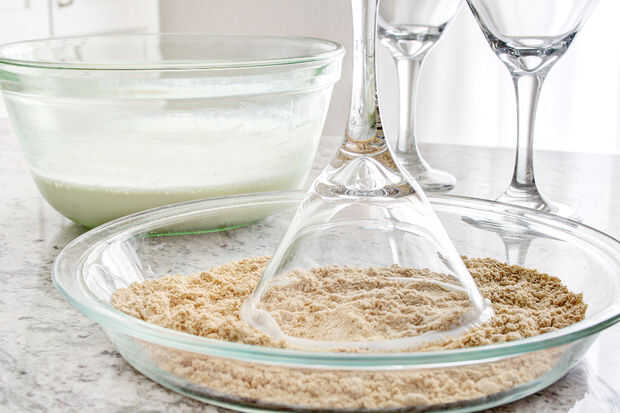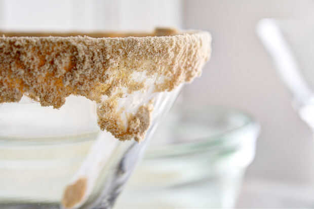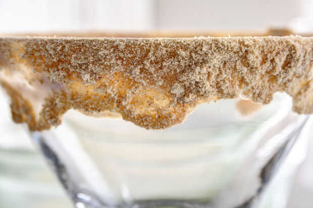 Ligeramente sumergir el borde de vidrio en la base de copa y capa de galletas machacadas, pero si desea servir el cóctel como una comida, lo bonito y grueso.  No juzgo.  Me encanta la corteza, también.
