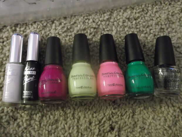 Que necesite para completar mi versión de las manchas del guepardo. Lo bueno es que puntos de cheetah se ven muy bien en cualquier color! Al tratar de las manchas, me di cuenta de que melón de neón no aparece bien en el blanco, usé colores pecaminosa "Gorgeous" (2 $ en Fred Meyer) en su lugar. También, mantener práctico removedor de esmalte de uñas y Q-Tips!