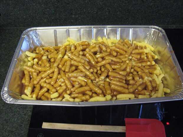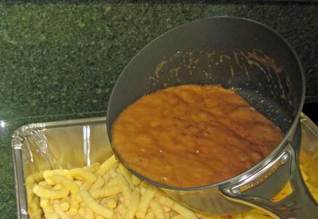 Rápidamente vierte el caramelo en los Cheetos.  Vierta todo en el y trata de cubrir toda la superficie.  No intente verter poco a poco mientras se mezcla.  Su recubrimiento será desigual.