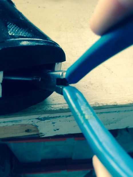 Ahora para unir el metal a la parte más superior de la bota, también conocido como becerro de la bota. Sujeta la bota en un vicio y perforar un agujero del metal en el arranque. Para sostener el metal a la bota simplemente atamos un tornillo en el interior de la bota, amortiguado por un (también en el interior) y luego una tuerca en el exterior (hay una foto que muestra el orden)