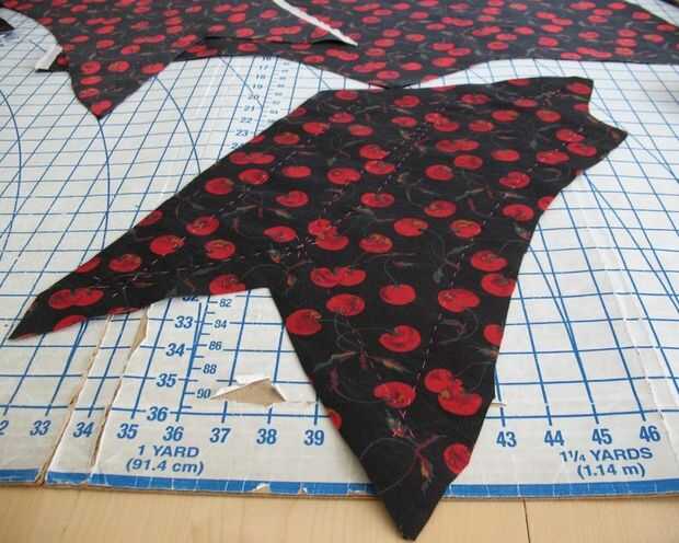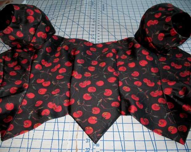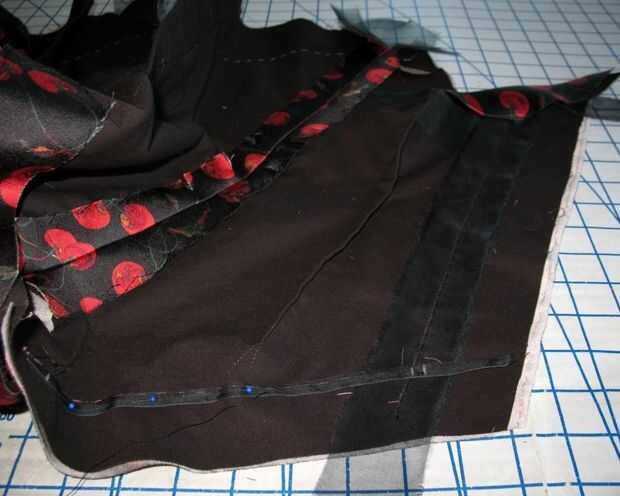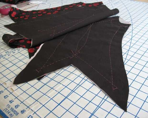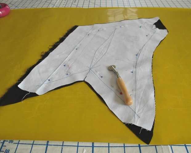 Hay un montón de puntos y esquinas interiores (o volteado boca abajo, un escote en v). Sólo para asegurarse de que estaba contento con el proceso, probado con algunos retales de muselina.