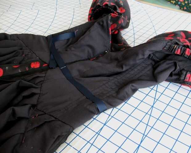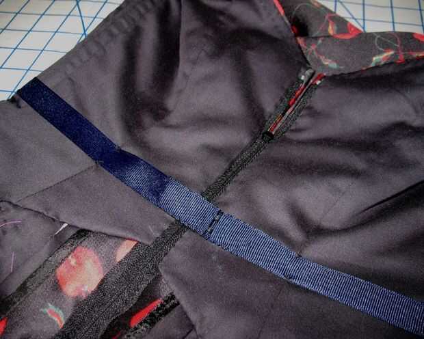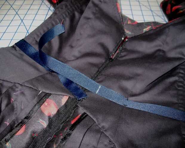Agrego una segunda estancia de cintura (menos importante) al vestido. El corselette se va a celebrar en, pero tener uno en el vestido hace comprimir mucho más fácil! Y sí, es azul marino. Es lo que tenía en mano, y no había tiempo para ir a recoger cualquier negro grosgrain.
