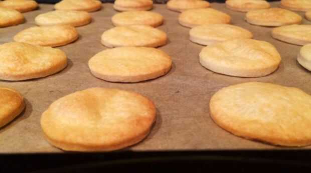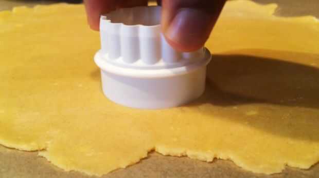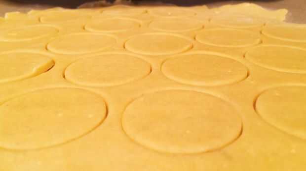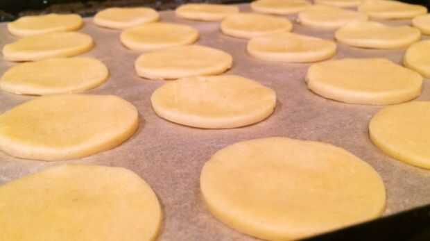 Estirar la masa sobre un papel parafinado hasta que la masa alcanza alrededor de 1 / 2cm de espesor. A continuación, recortar pequeños círculos con un cortador de galletas (es importante para asegurarse de que estos círculos pueden caber dentro de los casos de la Magdalena). Coloque los círculos en una bandeja para hornear y hornear durante 10-12 minutos a 180degrees C.
