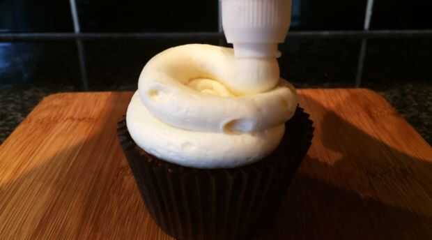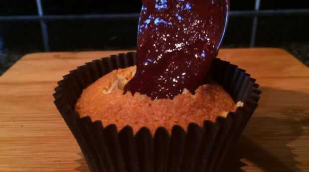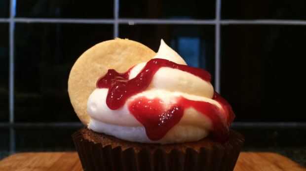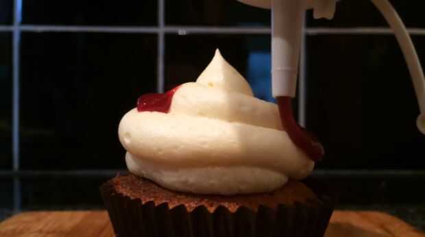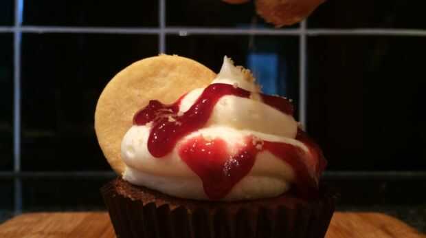 Pulso la guinda conservar hasta que tenga una consistencia de mermelada/jalea líquida. Cortar la parte superior de los cupcakes y cuchara en algunas de la conserva de cerezas. En una batidora, bata la mantequilla y el azúcar glas hasta pálido y esponjoso. Terminar añadiendo la leche y vainilla y batir por unos 5 minutos. Tubo de la crema sobre los cupcakes y salpicar de conservar cereza en la parte superior. Cortar los círculos de masa restantes por la mitad y coloque encima los cupcakes. Si usted tiene alguno de los círculos de masa izquierda, machacar encima y espolvoree sobre los cupcakes.