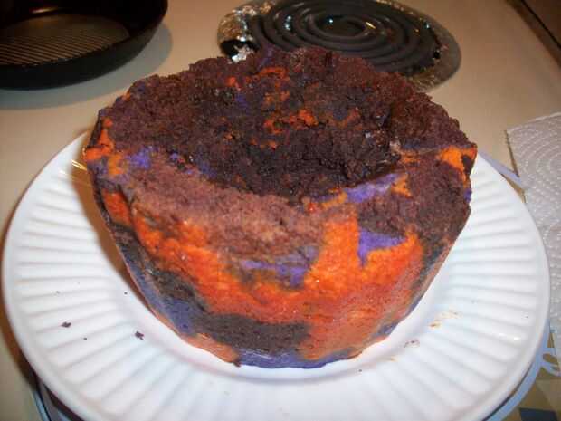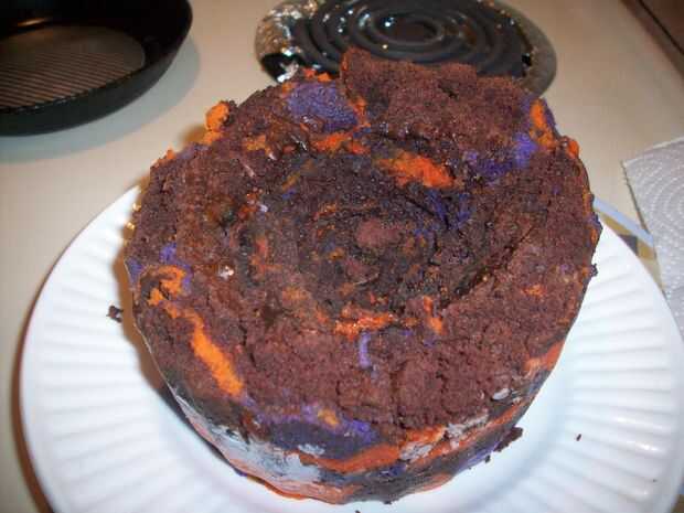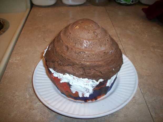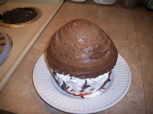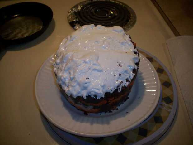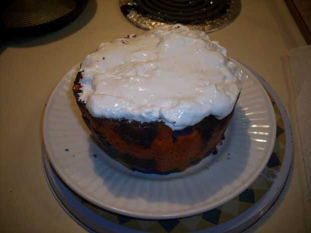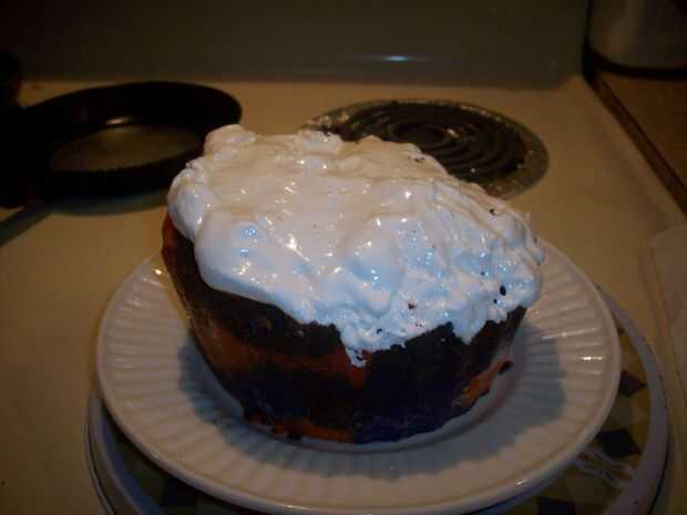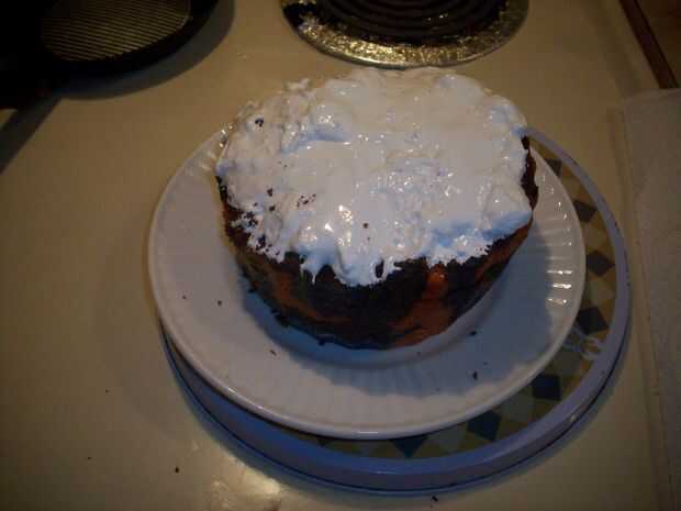 Congelar la torta de mármol y la tarta de queso. Quitar algunos del interior de la torta. Añadir tanta crema de malvavisco como puedas. La tarta de queso en la parte superior de la pila y vuelva a congelar.