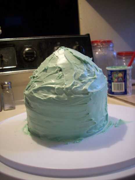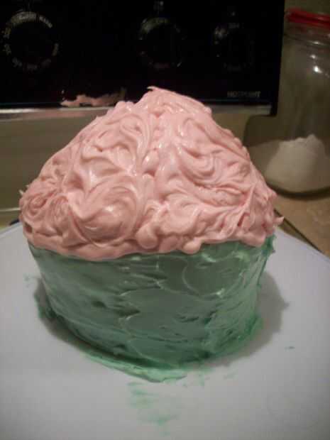 Desea cubrir la torta entera en el mismo hielo para ayudar a mantener juntos y para asegurarse de que todo está cubierto. Luego decorar como mejor parezca. Usé una bolsa con glaseado rosa y un kit de helar. Luego vuelva a congelar y servir frío.
