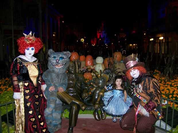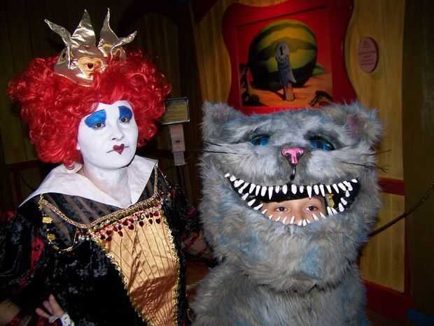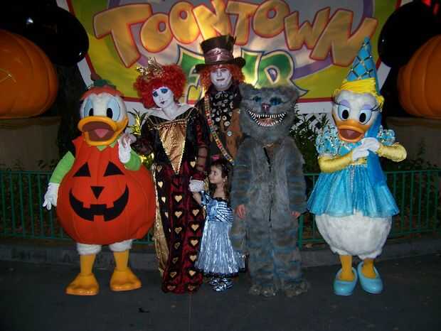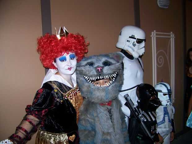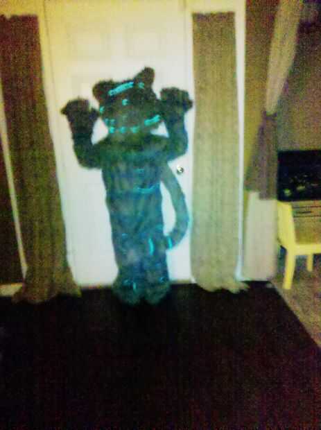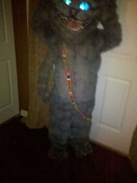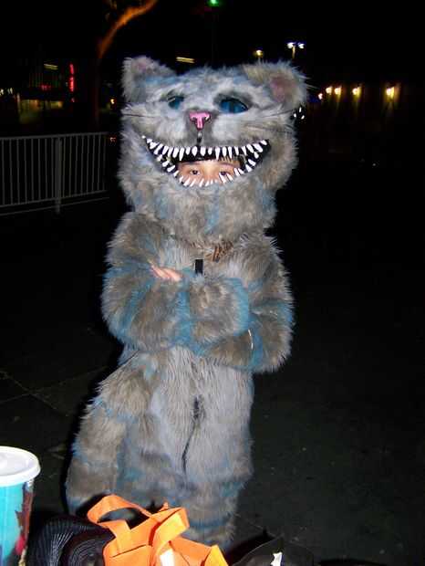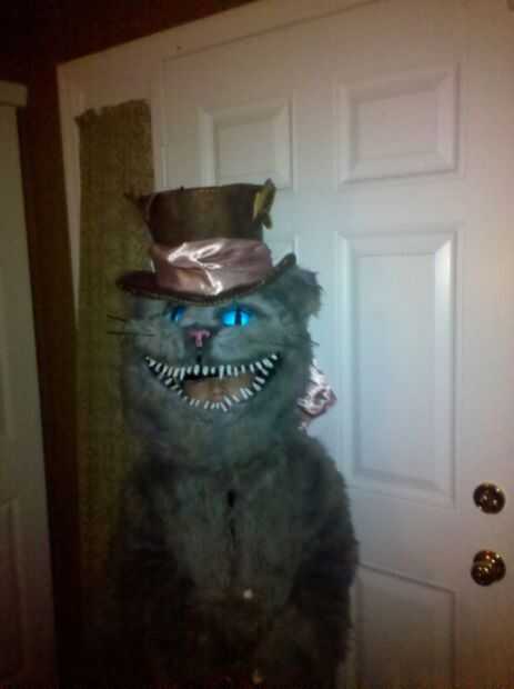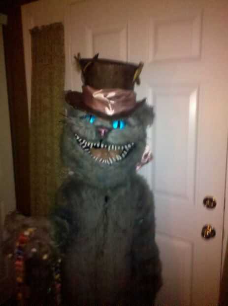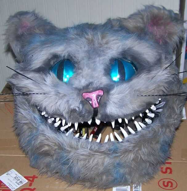 Traje de gato de Chesire hecha a mano en casa. La cabeza fue hecha de malla de espuma y plasic de tapicería para la forma y cubierta de tela de la piel luego retocada para crear las rayas azul. La nariz y los dientes eran mano formada de fimo. Los ojos eran de resina poliester y aerografiados en la parte trasera para dar un color azul brillante y luego luces led fueron cableadas dentro de los ojos para hacerlos brillar. Luces de el alambre se rosca a lo largo de la cabeza, cuerpo y cola para crear el efecto "brillante" el gato de cheshire ha. Un ventilador de computadora fue atado con alambre en la cabeza para refrescarse así. Esto fue hecha con los disfraces de Alicia, la Reina Roja y el sombrerero loco en la foto de familia. Nos encanta la película y quería compartir nuestra creatividad y de vestir para halloween. Fuimos a Downtown Disney en halloween y Mickey no tan asustadizo de Halloween 1 de Nov. Había cerca de 300 personas pedimos y tomar fotos con nosotros. Fue muy divertido compartir nuestros disfraces con los niños y familias de todo el mundo.