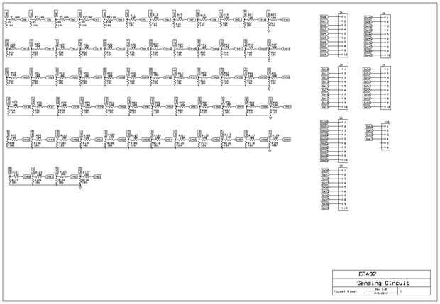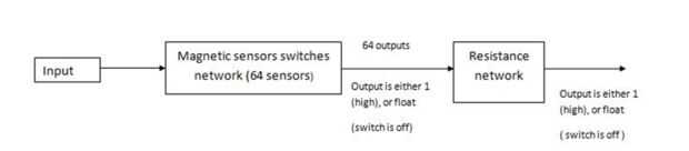 A continuación, se diseña el circuito que controlará los 64 sensores. Como se ha descrito antes, cada sensor hará que un circuito cerrado o abierto. Antes de conectarlos al microcontrolador, se establecen algunas normas. Para el microcontrolador determinar si el sensor está abierto o cerrado, la salida de cada sensor debe ser 1 (alto) o 0 (bajo). Es necesario un circuito que realiza esta tarea. Sin establecer estas normas, los Estados de los sensores será "flotar" cuando están abiertos y no cero. Lo que se necesita es añadir un par de resistencias en cada sensor, se asegurará de que la salida del sensor es 1 (alto) o 0 (bajo).