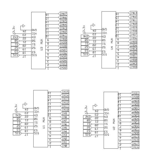 En el diseño, se utilizan 4 multiplexores con 16 canales cada uno (que es un total de 64). Entonces una sola salida además de las clavijas de "seleccionar" se conectarán al controlador, ocupando un total de 9 pines de I/O