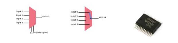 Ahora que los sensores estén ajustados a 0 o 1, puede conectar al controlador principal. Sin embargo, microcontroladores en general no pueden manejar esta enorme cantidad de sensores (64). Por lo tanto, se requiere un circuito de decodificación. Un multiplexor es utilizado para hacer la descodificación. Un multiplexor (MUX) es un chip que actúa como interruptor, donde se conecta varias salidas a una sola entrada y cambia entre ellos.