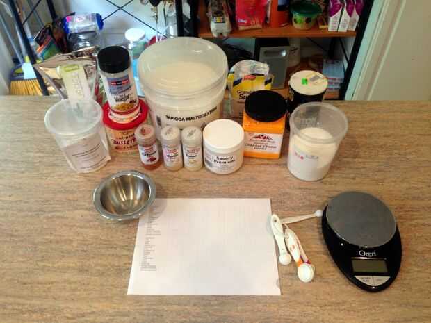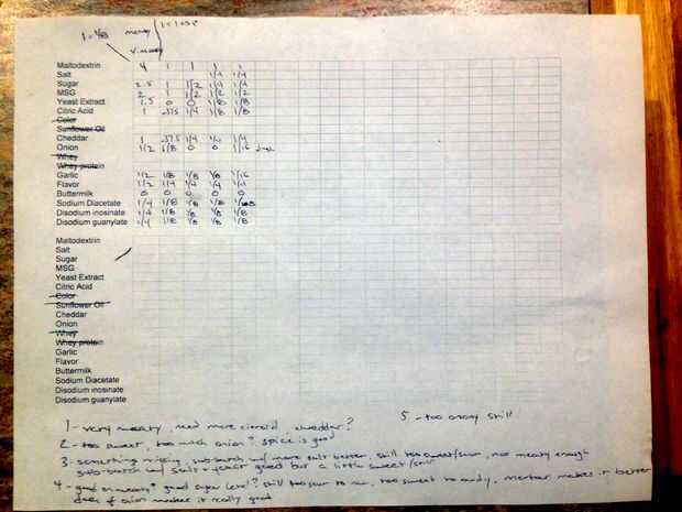 Creamos una hoja de cálculo como (adjunta) para grabar nuestras diversas recetas de lote y luego simplemente fue de gusto para la creación de futuros lotes. Nuestro primer lote probado demasiado carnoso, marcó de nuevo el extracto de levadura, pero subió el MSG para mantener el sabor salado. Diacetato de sodio sólo estaba disponible como sal y condimento de vinagre y tenía sal como ingrediente principal, así que no agregamos sal adicional a muchos de nuestros primeros lotes. Algunos de los otros ingredientes ha decidido ignorar (colores, suero de leche, proteína de suero, aceite de girasol), pero sería probablemente experimentar más con ellos (como el aceite) lotes futuros.