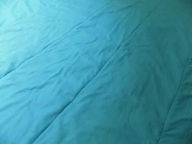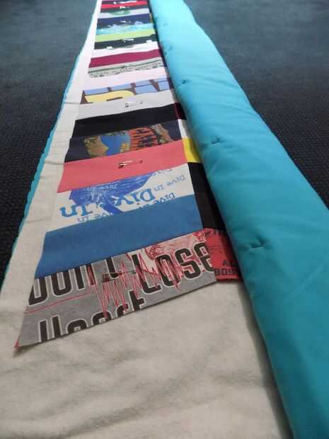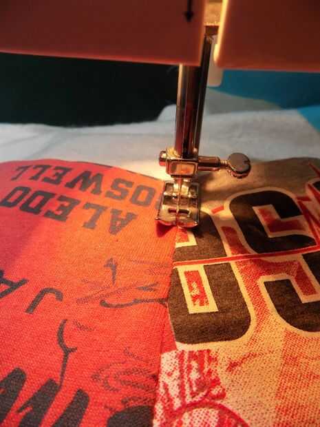 Enrolla un lado del tejido hasta el punto que se puede ver sólo una costura vertical en la parte superior de la colcha. Esto ayudará a mantener el lado más largo del tejido manejable como usted trabaja su manera a través.