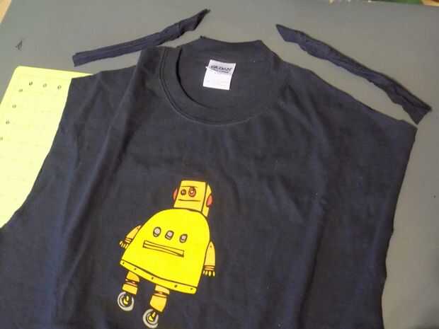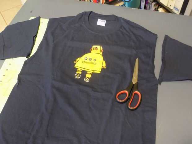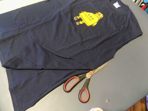 Coloque una camiseta sobre su estera del corte para que no queden arrugas grandes. No necesita planchar primero, desea para cortes relativamente rectos en la parte delantera y trasera.