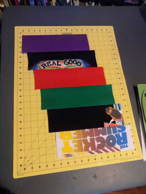 En este punto, sacó dos largas mesas para disponer el orden de un montón de piezas que una raya vertical. También podría hacerlo en el piso, pero tengo un perro particularmente peludo que le gusta la pista de barro alrededor de la casa. No obsesionarse demasiado sobre el orden a menos que desee crear un patrón. Para una mirada más al azar, como el mío, simplemente haga lo mejor para separar los colores más comunes y piezas con grabados vs aquellos con un color sólido. También no intentar velar por que cualquier impresiones lado derecho hacia arriba.