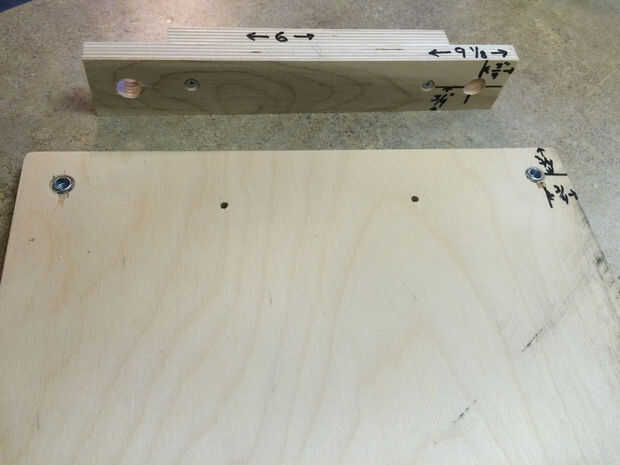 5. Crear un bloque pequeño de madera contrachapada para el soporte inferior: 1/2" espesor x 1-1/2" ~ 2" de alto. Perfore un orificio de ajuste flojo para el perno y un ~3/16 "profundo avellanado para la cabeza del perno y la arandela.
