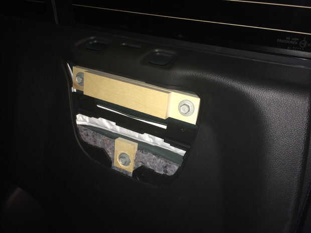 6. Usando los tres pernos de montaje de montaje reposacabezas original, coloque los dos soportes de madera que hiciste. Estos recibirán los tornillos requeridos para montar la pieza rectangular con los ganchos.