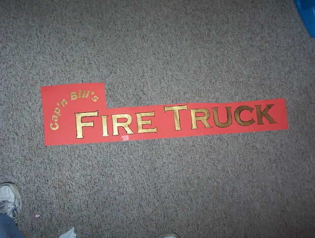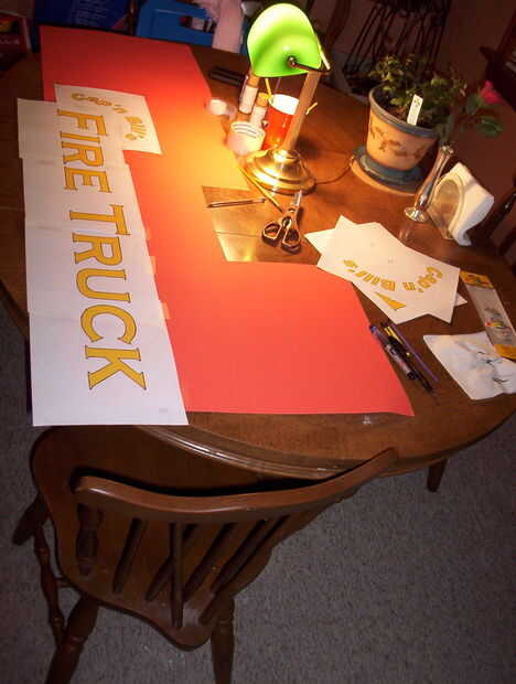 Una vez más, es mi esposa sufrida al rescate. Señaló que si había trazado las Letras con suficiente presión, sería una impresión en el cartón que podría utilizar como una guía. Ella tenía razón, y funcionó como un encanto. Utiliza una pluma para llenar en la impresión y había pintado las Letras con pintura de oro y había delineado en negro. Tardó aproximadamente una hora y media, pero tengo uno hecho y parecía buena. El signo para el otro lado tendría que esperar hasta la noche siguiente.