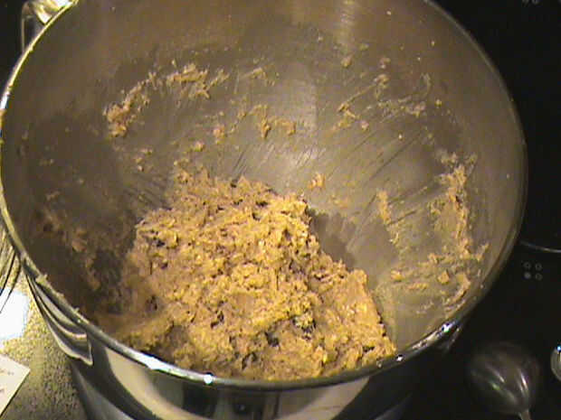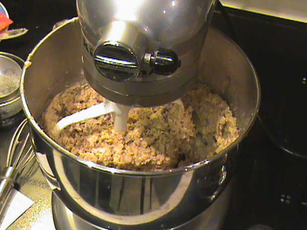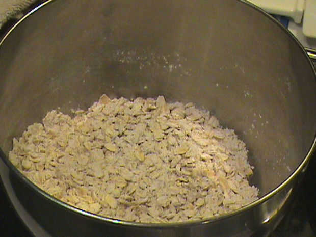 En otro recipiente agregue los ingredientes secos juntos. Mezclar la harina, bicarbonato, canela y avena hasta que se mezcle bien.