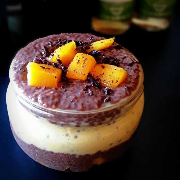 Parfait de chocolate de chia de mango es verdaderamente divina. Capas de Pudin de vainilla-infundidas de mango chia son envueltos en capas de chia de chocolate dulce para crear un desayuno de prefecto, postre (o una deliciosa merienda?) que tendrá que sacar con pala furiosamente. Lleno de sabor, estratificación muy y mucho de la nutrición. Hace para un desayuno muy ligero.