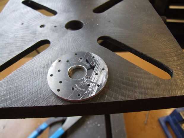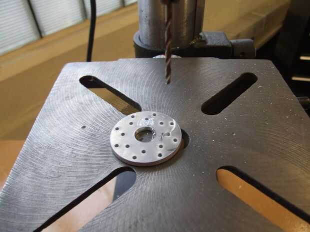 Porque la rueda finalmente se sujeta el hilo, 8 agujeros internos de la placa de centro serán eventualmente perforados hacia fuera ("liberado") para pasar un tornillo 4-40. Encontrar el agujero utilizado como plantilla y perforarlo con una broca #32. Sólo una separación de taladro esta un agujero.