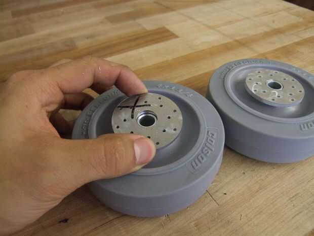 Con la placa de centro se deslizó sobre la rueda Colson, utilice un taladro con la broca #42 para perforar un agujero de aproximadamente 1/2" profundamente en el Colson, con un orificio interno en la placa del eje como guía.