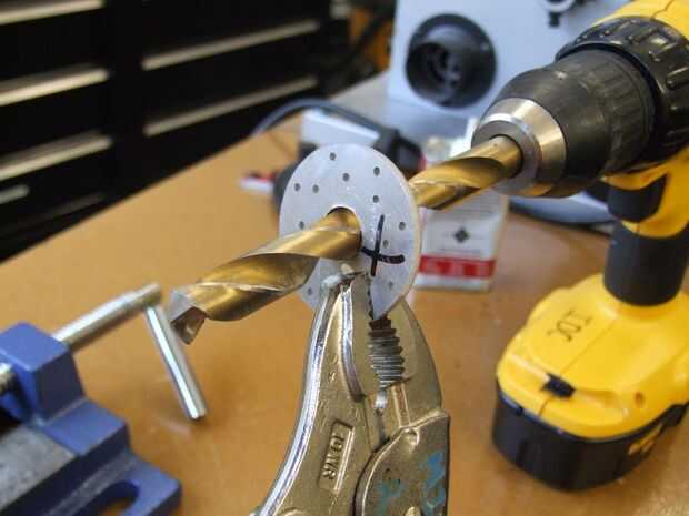 Para utilizar el taladro de 1/2" a claro a mayor que 1/2" agujero, usted debe inclinar la placa del eje mientras se perfora! Si usted decide hacer esto, el cubo placa Debe ser asegurado con pinzas con seguro. No trate de usar regular ajustables o pinzas de nariz para tratar de mantener la presión. Opcionalmente puede sujetar la placa en una prensa y tilt & roll el taladro en su lugar.