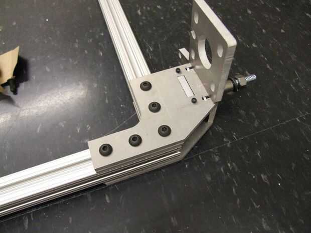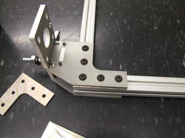 Estos soportes en L son realmente altura los espaciadores de las placas de esquina. Levante la esquina inferior izquierda (definida por NS-18-1, que ahora es la parte de atrás) y deslice la RMMM izquierda por debajo de ella (la RMMM izquierda debe tener su poco freno montaje dedo apuntando hacia delante). Deslice a un espaciador de 1/8" en ambos lados de la protuberancia y visualmente, alinee los orificios.