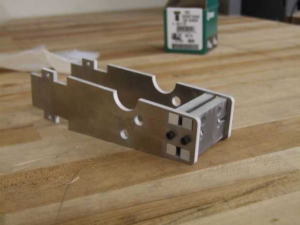 Asegúrese de que el titular de la manga va en el final de las placas laterales y la parada de la manga está detrás de él. #4-40 agujeros alinearán las piezas correctamente - la brecha en así tuercas cuadradas o tuercas pueden ser utilizadas, el hex que sobresale un poco pasado al ras con la superficie generalmente. Ras-apretar estos tornillos por ahora, porque...
