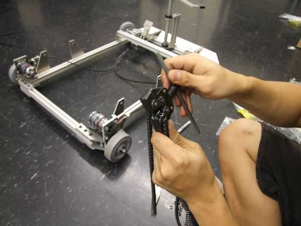 Una vez que ambas cadenas enganchadas, debe ser capaz de probar los frenos. Rodillo Chibikart a mano lentamente por el suelo y golpeó el pedal mientras se desplaza. Ambas ruedas deben participar al mismo tiempo. Si uno participa significativamente antes, siga las instrucciones en el paso 32 para reducir la holgura de la lag.