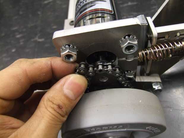 Ahora puede apretar los cuatro pernos de motor. Levante ligeramente el motor - lo suficiente como para tomar la holgura de la cadena y no más (después hacia fuera - la cadena este muy ajysta demasiado). Luego apriete los pernos de motor uno a la vez.