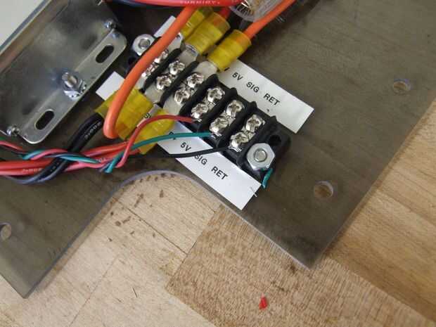 Estos cables son lo suficientemente pequeños como para que jamming bajo las cabezas de los tornillos es suficiente. Si quieres más robustez, 22 ¢-26Ga terminales de los cables están incluidos en la lista de materiales, por lo que los puede utilizar en su lugar. Fui por delante y desnudo-cable.