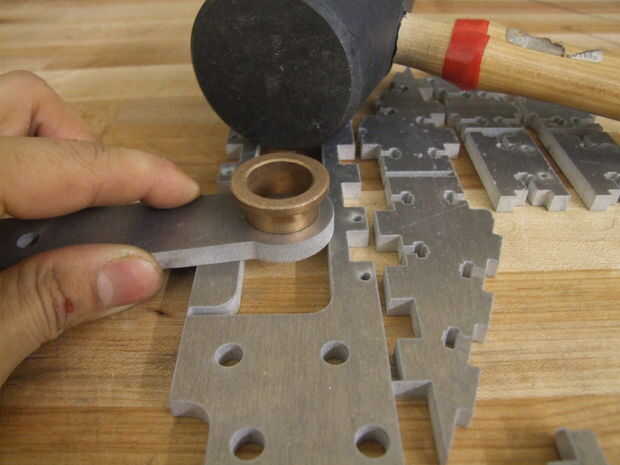 Porque estos bujes son más gruesos que el material, no puede ser informados en su lugar. Suspender el agujero del buje sobre un boquete en el panel de 1/4"(que actúa como un espaciador de Panel conveniente en este caso). Utilice un mazo de goma y golpee suavemente los bujes para sentarlos - orientación no importa en este caso ya que la placa es simétrica de arriba a abajo. Cuando el manguito está sentado, puede dar unos whacks más contundentes para hacer sus pestañas al ras con la superficie del material.