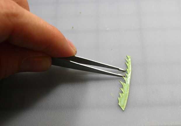 Esta parte puede ser un poco complicada, por lo que ayuda a colocar las cosas de antemano en un pedazo de cinta de papel. Empezar a unir piezas más grandes, luego añadir los detalles más pequeños. Para los pedazos más grandes, utilizo pegamento seco Zip; para las piezas pequeñas, yo uso el lápiz de pegamento .7mm y un par de pinzas. Se refieren a sus patrones para diseñar correctamente las cosas.