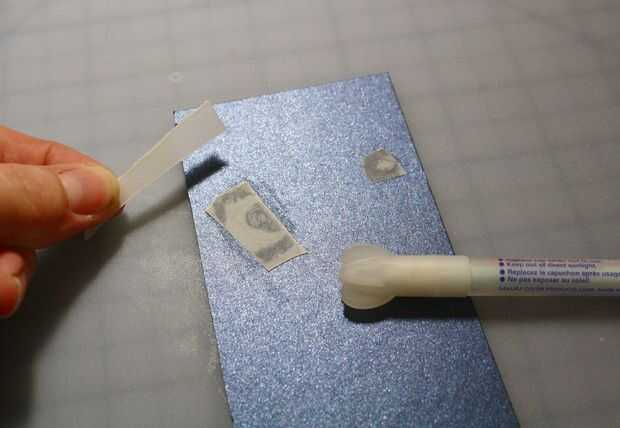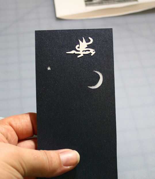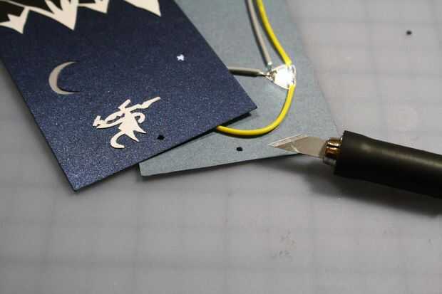 Para este marcador, quería tener la estrella, Luna y tubo de luz. Para lograr esto, cortar los agujeros hay y pegados algunos vitela blanca sobre la espalda. Para la pipa, y puesto que sólo tenía LEDs blancos, pongo un trozo de cinta naranja en la parte posterior del orificio del tubo, que trabajó bien para obtener el color correcto.