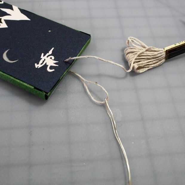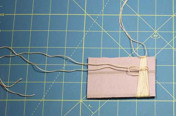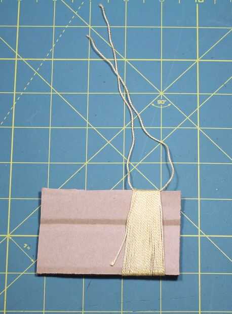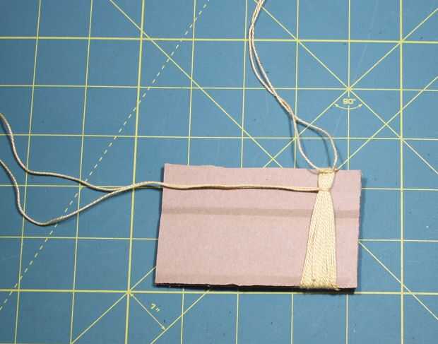 "Cortar un pedazo de cartón por lo menos 1.5" alto y envuelva el hilo alrededor de él como se muestra. Enrolle la seda del bordado por lo menos 20 - 30 veces por el tablero. Hilos y cuerdas más gruesas pueden necesitar menos. Experimento.