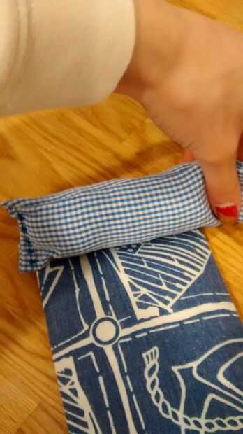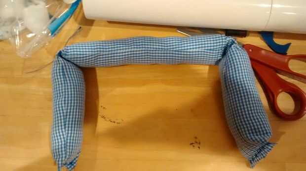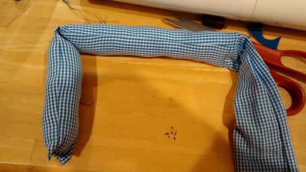 Tomar su relleno y ponerla en el tubo. Usé un pedazo largo de cartón para empujar todo el camino hasta el final. Una vez que la parte de relleno del tubo es tan larga como uno de los lados cortos de la cama, luego coser esta sección del tubo cerrado. (Ver segunda foto)