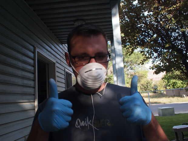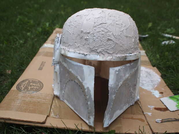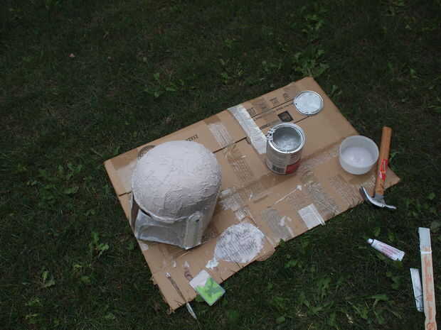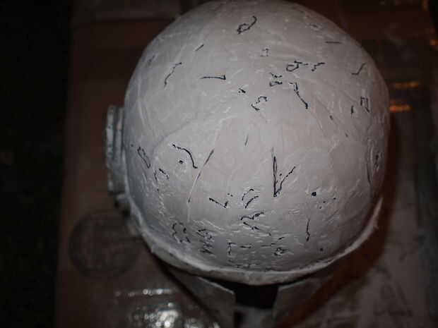 • Una vez que se seca, la arena hacia abajo hasta la suave. Asegúrese de usar la máscara, Bondo polvo es malo para los pulmones. Después de esto que esbozar todos los puntos de desiguales y baja con un marcador para poder fácilmente encontrar y fijar con la siguiente capa de Bondo. Otra vez deja secar durante una hora y comenzar a lijar hasta completamente lisa. No estaba preocupado con ser perfecto ya que es casco de batalla y se ven cualquier imperfecciones como cicatrices de batalla.