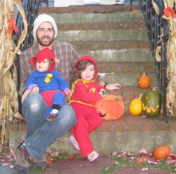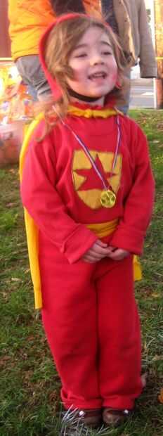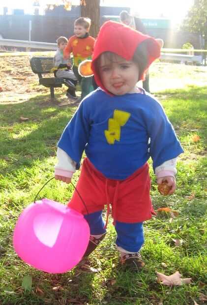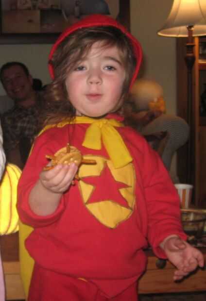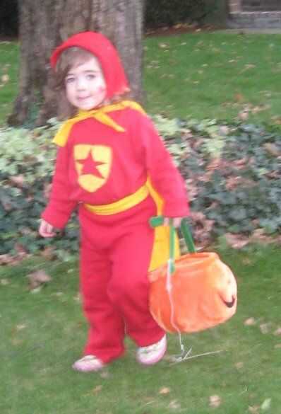 PBS ) y su hermana pequeña, ser demasiado joven para quejarse, era el compañero leal, capitán Huggyface. Los trajes fueron fáciles. y de bajo costo. Para chica de palabra tengo sudadera roja de walmart. Cortar el logo de tela amarilla, y pegado, entonces zigzag cosido lo a la camisa. El cabo es un rectagle de tela amarilla, con lazos cosidos en. La campana es cuarto dos círculos de fieltro cosidas, con elástico para la barbilla.