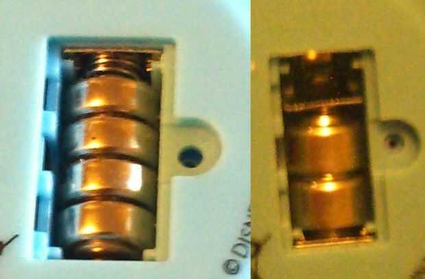 El reloj utiliza cuatro LR41 pilas de botón que proporciona 1.5 voltios. Esto es demasiado para nuestro láser, así que después de investigar un poco, encontré que pilas para aparatos auditivos de tamaño 13 tienen el mismo diámetro pero son casi dos veces tan largas, proporcionando el voltaje que necesitamos y extender la longevidad.