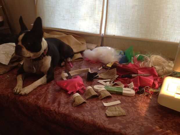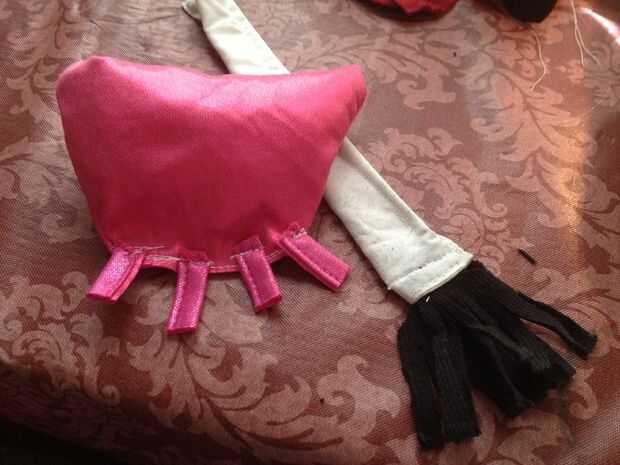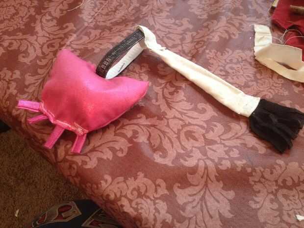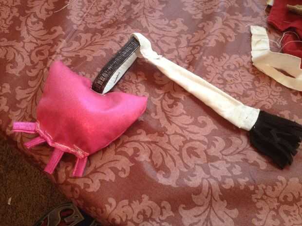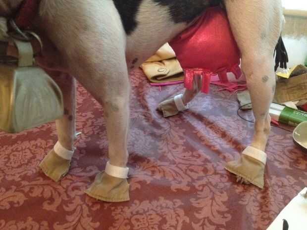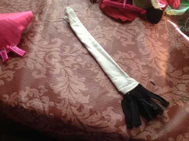 Para la cola, cortan un pedazo negro de camisa vieja de mi esposo. Y para la parte blanca, tomé algunos forro de bolsillo de los pantalones cortos de color caqui. Sólo asegúrese de que sea tiempo suficiente para que su... vaca-perro. Un poco doble la tela blanca alrededor de la parte negra y coser la cola, así como la pieza negra. Una vez fue todo cosido, tomó las tijeras y recorta la parte negra para parecerse a los pelos. Ahora que se hace la cola, tomar la punta sin el pelo, lazo alrededor del elástico de las ubres y coser encima de. (Cola para cola, solamente). Así es aros sobre el elástico y se puede ajustar o moverse según sea necesario para el ajuste.