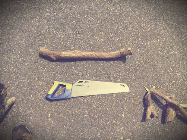 Materiales: cuerdas del amortiguador auxiliar madera rama Sierra taladro de mano (para pretaladrar los agujeros) (x 2) de la cadena o la cuerda (longitud variará) "S" ganchos tirafondos con ojo (x 2)