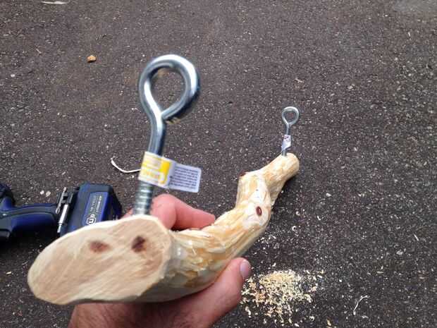 • Utilicé tornillos de 3/4 "x 4,5" con un ojo. ¿Por qué no conectar el cable de cadena directamente en el oscilación? Encontrar el hardware adicional ayuda a la acción de balanceo y también ayuda a mantener el columpio más estable para cuando los pollos salto de encendido y apagado.