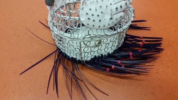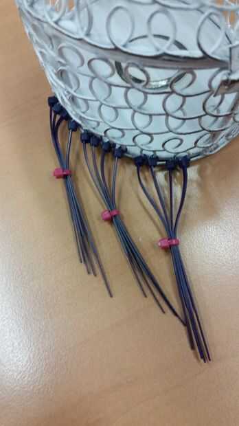 Esta bola es de abrazaderas de plástico (zap correas) y tiene una bonita coloración matemática.Se necesita:60 lazos pequeños zip (correas, ataduras de cables plásticas de zap).  Ataduras de cremallera grande son más difíciles de hackear para este pro
