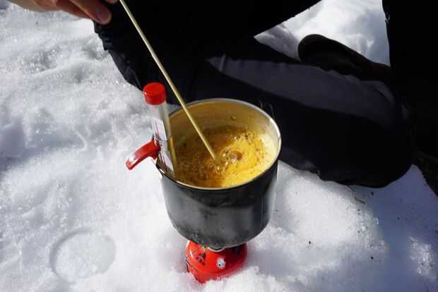 Azúcar caliente es muy peligroso. Va quemar mucho más fácilmente que el agua o el aceite de la misma temperatura. Por suerte, hay nieve como para tratar sus quemaduras. :-)