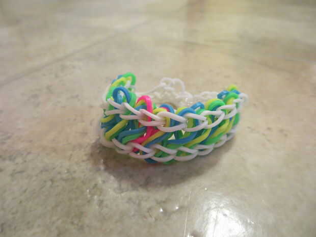 creo que esto es un braclet muy fácil para hacer. Espero que disfruten este INSTRUCTABLE. :)Paso 1: Colocación de los elásticos Primero escoger tres colores. Iniciar en la clavija central de su telar y salen a ambos lados en su telar. (Foto 1)Ahora v
