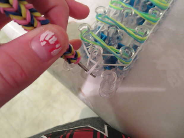 creo que esto es un braclet muy fácil para hacer. Espero que disfruten este INSTRUCTABLE. :)Paso 1: Colocación de los elásticos Primero escoger tres colores. Iniciar en la clavija central de su telar y salen a ambos lados en su telar. (Foto 1)Ahora v