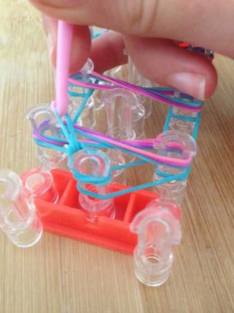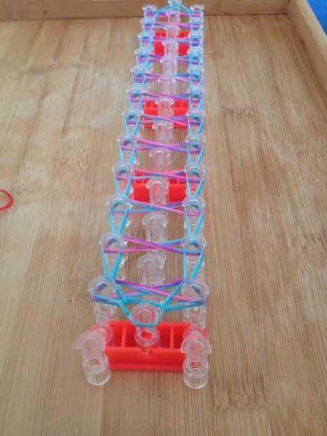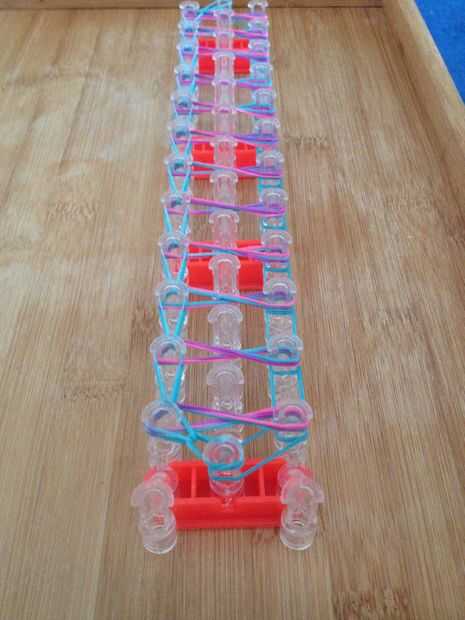 Esta es la pulsera como se verá cuando esté terminado. Yo recomiendo usar 3 colores diferentes para esta pulsera. Antes de poner las bandas en el paso siguiente Asegúrese de que doble todas las bandas, si crees que me refiero a hacer una banda de la
