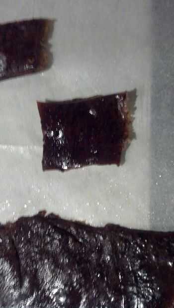 Una vez que el caramelo esté listo, añadir el café. Retire la cacerola del fuego y verter en una bandeja para hornear y dejar enfriar. Una vez que la mezcla esté fría, cortar para arriba en cerca de 1 pulgada cuadrada. En las imágenes verás dos lotes diferentes, olvidé de tomar fotos de ciertos pasos y tuvo que rehacer todo el proceso. el papel sulfurizado de horno se corta en 2" por 3" rectángulos. Tomar los caramelos y doblarlas un par de veces y rodar firmemente para arriba en el papel de pergamino. Tuerza los extremos y repita hasta que haya terminado con toda la masa.