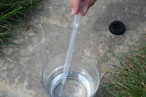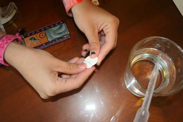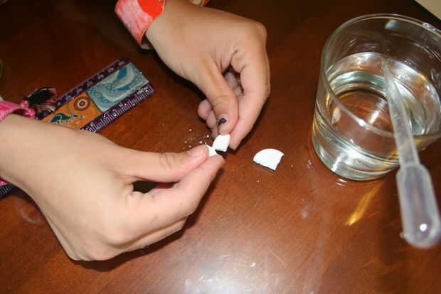 Tiempo para poner en tus gafas. La rotura de una pieza de Alka-Seltzer y poner en el vaso. Encontrar un lugar plano. El exterior es mejor. Llene el cuentagotas de agua con agua.