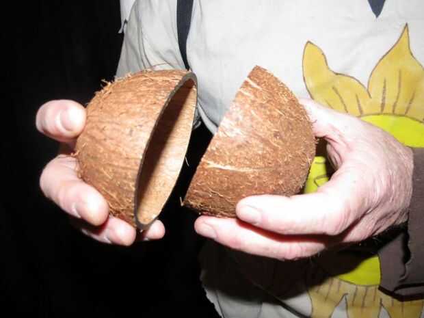 Abrazadera interior coco y utilice una sierra para metales o similar para cortar una pequeña hendidura en la cáscara dura alrededor de un cuarto camino abajo.